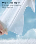 Пакет помітно м'яко просідає під натиском зверху, а полотно під пальцями пружинить і тихо шарудить. Верхній отвір стягнутий стрічкою, тому лист виходить із легким опором, залишаючи край наступного назовні. Одна сторона серветки ковзає по шкірі майже гладко, тоді як інша з дрібними крапками відчутно чіпляється.