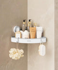 This corner shelf with suction cups will help you stay organized by keeping bottles and toiletries neatly organized. Order a bathroom organizer with hooks for easy use! Keywords: buy a corner bathroom shelf, suction cup cosmetics organizer, shampoo shelf, bathroom hooks.