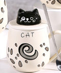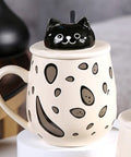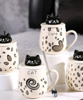 SEO keywords: ceramic mug with lid, cup with a cat, gift for a cat lover, stylish kitchenware, set of cups with spoons, original coffee mugs, creative cup with lid