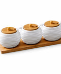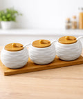 Добавьте изысканности вашей кухни с набором керамических баночек для специй . Идеальное сочетание белой керамики и натурального бамбука создает тёплую атмосферу и обеспечивает удобное хранение соли, сахара, перца или других специй. Каждая баночка оснащена крышкой и ложкой, а все вместе размещено на аккуратной деревянной подставке – красиво, удобно и практично.